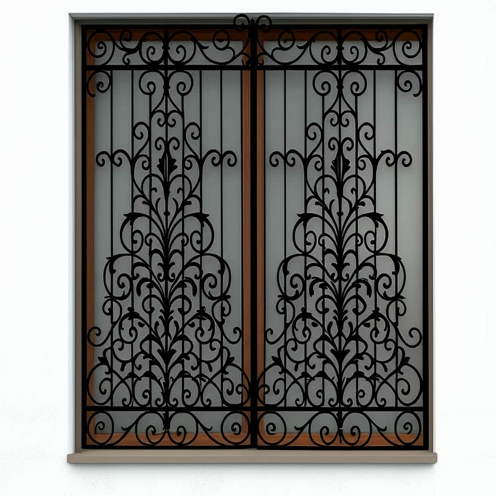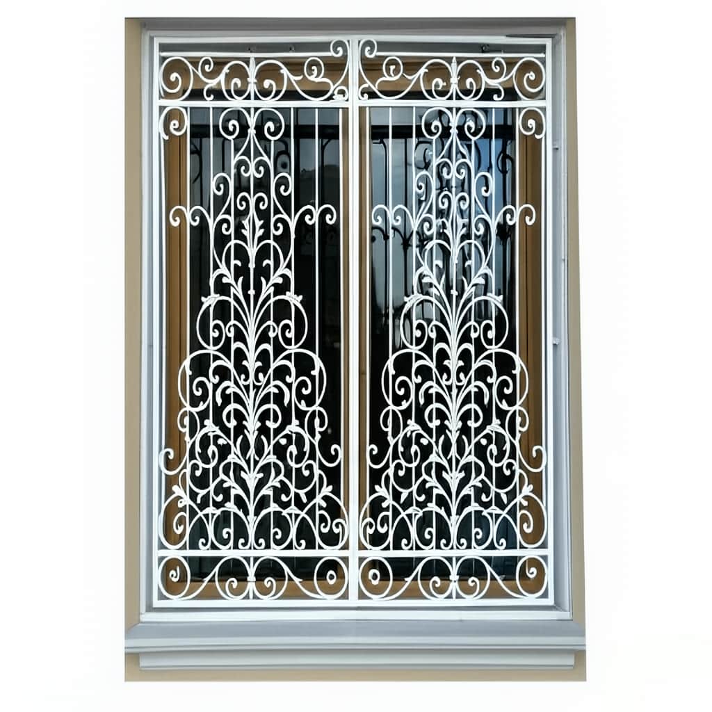 حفاظ پنجره مدل اشرافی زرین با متریال آهن فرفورژه دست ساز و ورق فولاد کم کربن S355 تولید می شود. میلگردهای ضخیم و پروفیل های مستحکم ساختار این مدل را تشکیل می دهند. پوشش پتینه کوره ای چندمرحله ای بر سطح کار اجرا شده که دوام بی نظیری در برابر رطوبت, نور خورشید و سایش ایجاد می کند. طراحی نقوش گل دار و پیچک های هنرمندانه, همزمان امنیت و شکوه را به نمای ساختمان می بخشد.