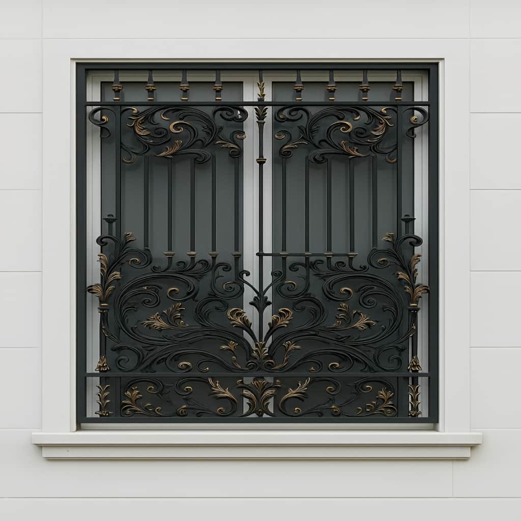 حفاظ پنجره مدل الیزه از آهن فرفورژه دست ساز با ورق فولاد S355 ساخته می شود که برای ایجاد شکل های پیچیده و حجمی طراحی شده است. میله های عمودی بلند با سرنیزه های اشرافی به این مدل امنیت بالا و جلوه ای سلطنتی می دهند. قسمت پایین این حفاظ با جزئیات پرجزئیات اساطیری و گیاهی طراحی شده که الهام گرفته از معماری کاخ ورسای و سبک های باروک و روکوکو است. طراحی قوسی و فریم تقویت شده, علاوه بر استحکام, به حفظ هماهنگی با نمای ساختمان های رومی کمک می کند. رنگ آمیزی این مدل با پوشش پودری الکترواستاتیک و پتینه دست ساز, آن را در برابر زنگ زدگی و آسیب های محیطی مقاوم می کند.